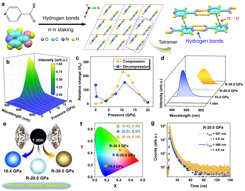 近日,英国威廉希尔公司官网高压与超硬材料全国重点实验室/综合极端条件高压科学中心杨新一教授课题组在有机分子的多色发光研究方面取得重要进展。提出利用压强工程调控初始不发光的异烟酸(INA)材料中分子间双电荷转移强度,实现从暗态到高质量多色发射(即蓝光、白光、黄光)的可控切换。相关研究成果以“Controllable multicolor emission from initially non-emissive organic molecules by pressure engineering”为题发表在《自然通讯》(Nat. Commun. 2025, 16, 8780)上。