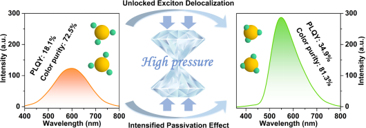 固态照明技术凭借其极高的光电转换效率和长寿命等优势,成为推动绿色低碳照明发展的关键力量。当前,开发新型半导体材料是实现更高能源利用率、推进可持续发展的重要途径。在众多材料中,量子点因其高发光效率、低生产成本和广色域覆盖能力,正逐步取代传统LED,占据市场主流。由于尺寸微小,量子点具有高比表面积,导致其物理化学性质强烈依赖于表面态的调控。通常情况下,表面原子因配位不饱和而形成大量悬挂键,进而显著降低量子点器件的性能。压强作为一种独立于温度和组分的热力学参量,能够有效缩短原子间距、调控材料的电子结构,为物质科学研究提供了新的维度和手段。在前期研究中,邹勃教授团队肖冠军课题组通过对CdSe量子点施加压力,有效增强了配体对表面无辐射缺陷的钝化作用,使其荧光强度提升了一个数量级以上(J. Am. Chem. Soc. 2018, 140, 13970−13975)。2024年,该团队进一步利用不同类型配体对CdS进行表面钝化,在高压下实现了其本征发光与缺陷发光的选择性增强,并最终获得白光发射,也为通过高压研究指导常压合成,进而服务常压科学奠定基础(CCS Chem. 2025, 7, 160–169)。2025年,该课题组系统研究了高压下不同配体包覆量对CdS光学性能的影响,在同一材料与选择性配体复合体系中,分别实现了从橙光到白光以及从橙光到蓝紫光的两类压致变色调控(Laser Photonics Rev. 2025, 19, 2401971)。
