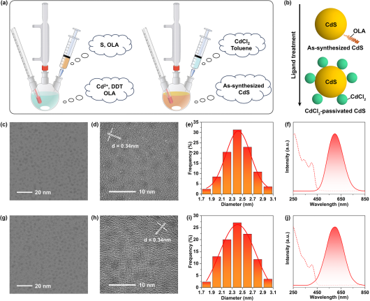 近日,英国威廉希尔公司官网高压与超硬材料全国重点实验室肖冠军教授等人在传统CdS量子点表面缺陷态的压力调控研究中取得重要进展。研究团队通过选择结合力更强、配位位点更丰富的原子配体CdCl2,成功合成新型包覆结构的CdS量子点。高压处理进一步强化了量子点与配体之间的相互作用,有效修饰了其表面态,促使激子向量子点表面离域扩展。压力有效优化了CdS–CdCl2界面,促进激子离域与表面钝化效应,从而显著提升了发光性能。该研究为拓展量子点材料在光电子学领域的应用提供了新颖的设计思路与理论依据。相关研究成果以“Enhanced Excitons Delocalization Toward High-Quality Emission Harvesting Unlocked by Pressure and Ligand Engineering”为题发表在《Nano Letters》上。