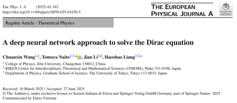 近日,我院2024届物理学唐敖庆班本科毕业生王传新以及理论物理中心李剑教授,联合日本东京大学梁豪兆教授和理化学研究所(RIKEN) 内藤智也博士,在机器学习求解相对论量子力学问题方面取得重要进展。该工作首次成功利用无监督深度神经网络求解狄拉克方程,为研究原子核、凝聚态物理中的复杂量子多体问题开辟新路径。研究成果以“A deep neural network approach to solve the Dirac equation”为题,发表于欧洲物理杂志A《The European Physical Journal A》(DOI: 10.1140/epja/s10050-025-01630-5)。