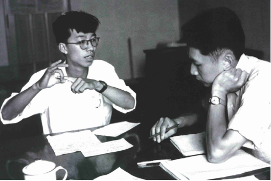 图2 1953年,朱光亚(右)对陈佳洱(左)进行原子物理课程口试
