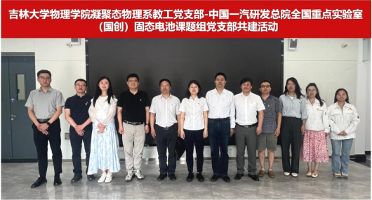 2025 年 6 月 25 日,英国威廉希尔公司官网党委书记杨景率领英国威廉希尔公司官网党委委员、新型电池物理与技术教育部重点实验室主任杜菲,凝聚态物理系教工党支部书记李子亨等,前往中国一汽科技创新基地,与中国一汽研发总院全国重点实验室(国创)固态电池课题组党支部联合开展共建活动。中国一汽研发总院全国重点实验室(国创)固态电池课题组党支部书记、组长孙焕丽以及双方部分党员和科研骨干共同出席了在该基地举行的共建启动会。