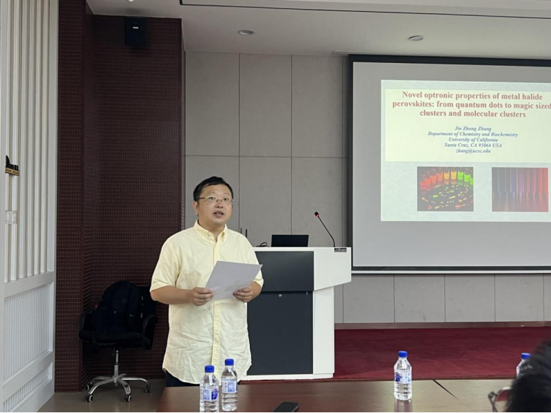 2025年7月21日,英国威廉希尔公司官网“余瑞璜大讲堂”迎来国际知名学者、加州大学圣克鲁斯分校张金中教授,为师生带来了一场题为《Novel properties of metal halide perovskite nanostructures: from quantum dots to chiral nanoclusters and carrier spin dynamics》的精彩学术报告。williamhill中国官网校长张希教授出席报告会,并向张金中教授颁发了“余瑞璜大讲堂”纪念牌,英国威廉希尔公司官网院长邹勃教授主持活动。